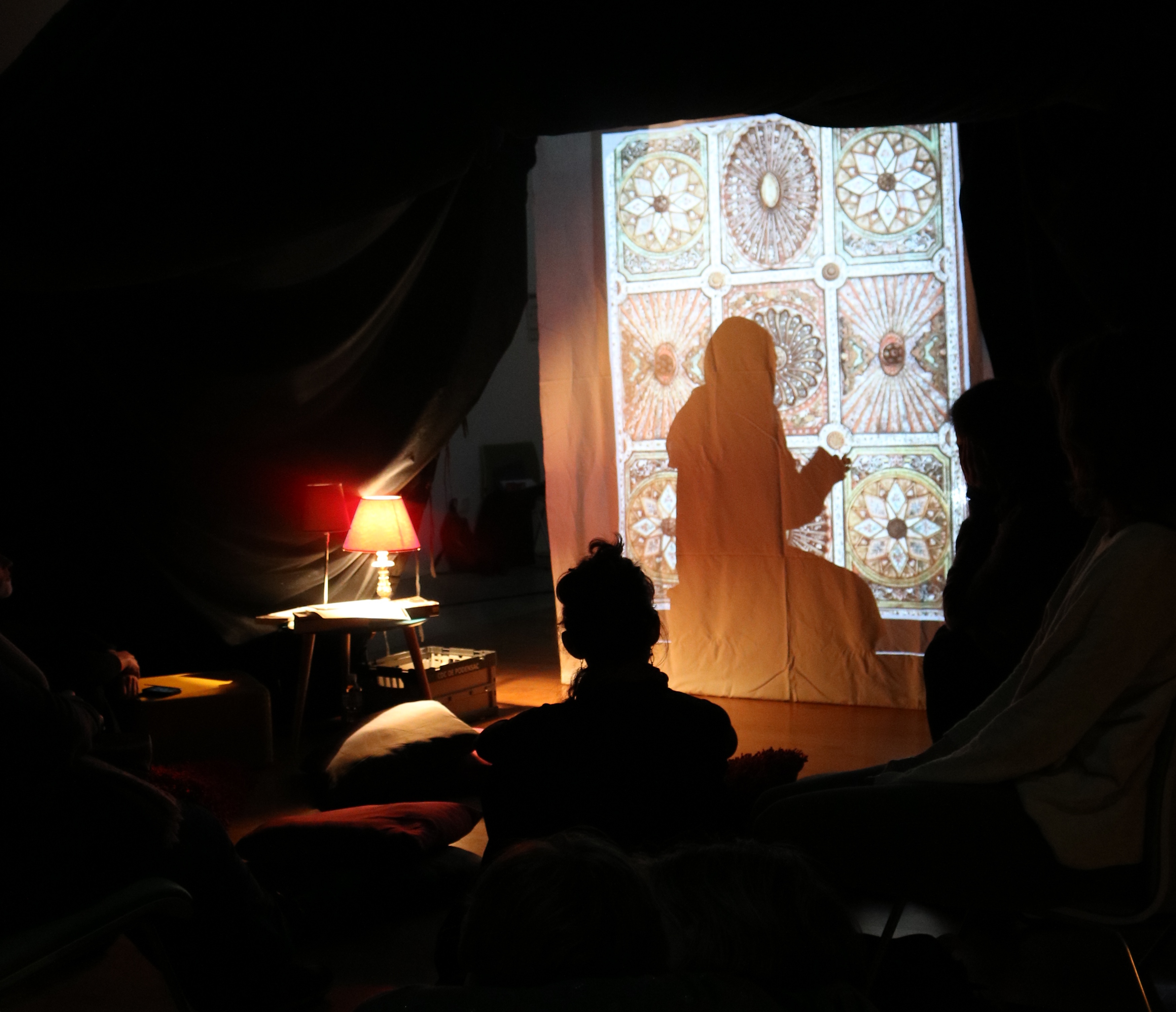 A gauche, le ventre de la nuit où nous entendrons tirades, monologues ou dialogues. Dans ce lieu, du tissu noir a été attaché telle une tente berbère, éclairée par une petite lampe ancienne. On y trouve chaises et coussins. Au fond, un drap blanc servira aux lectures en ombres chinoises.
