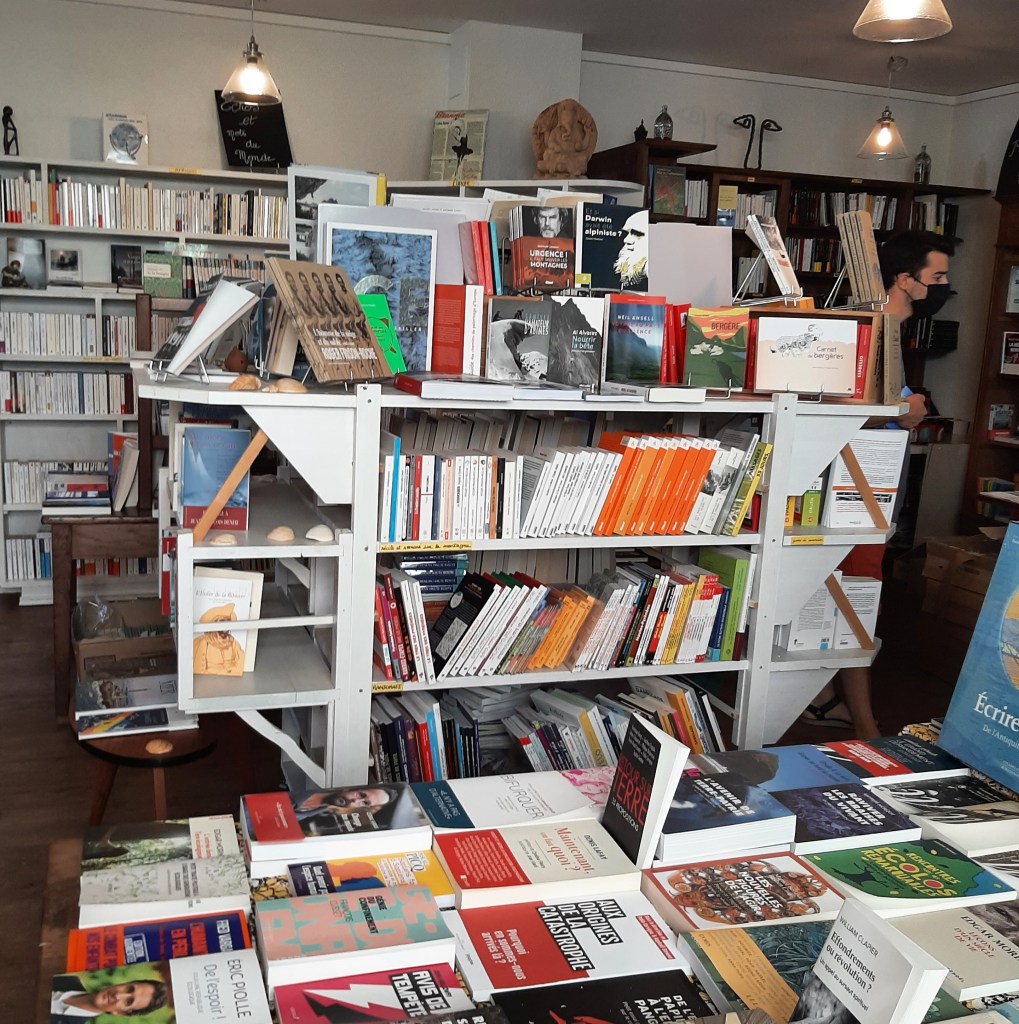 Karine a fondé ce bistro-librairie il y a quatre ans. Nourritures terrestres et spirituelles s’y côtoient et répondent parfaitement aux besoins des randonneurs. Plats uniques et simples en terrasse, important choix d’ouvrages dans l’espace librairie qui prolonge le café-restaurant. Le fonds est riche et diversifié : il y a le coin des thrillers, le coin de la jeunesse, un important rayon de BD tourné vers l’aventure, un choix non négligeable de cartes IGN et d’ouvrages sur les Pyrénées. Sur les tables, quelques parutions romanesques récentes, beaucoup d’essais sur l’écologie et d’ouvrages philosophiques. Le nom d’Edgar Morin revient souvent …