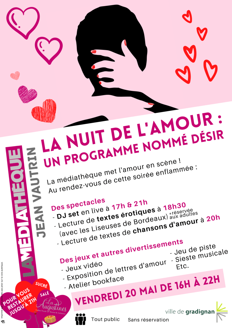 La Nuit de l’amour est proposée par la médiathèque Jean Vautrin, à Gradignan de 16h à 22h. Sans réservation. Tout public, sauf pour notre lecture qui est réservée aux plus de 18 ans et aura lieu à 18h30 (durée d’une heure environ).