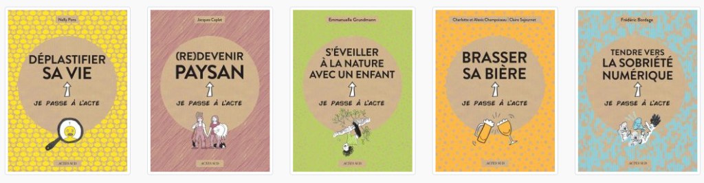 La collection Je passe à l’acte chez Actes Sud et Kaizen réunit sous ce même graphisme plusieurs documentaires d’actualité : (Re)devenir paysan ou Changer l’école de l’intérieur ou encore Déplastifier sa vie… Une collection à petits prix à découvrir.