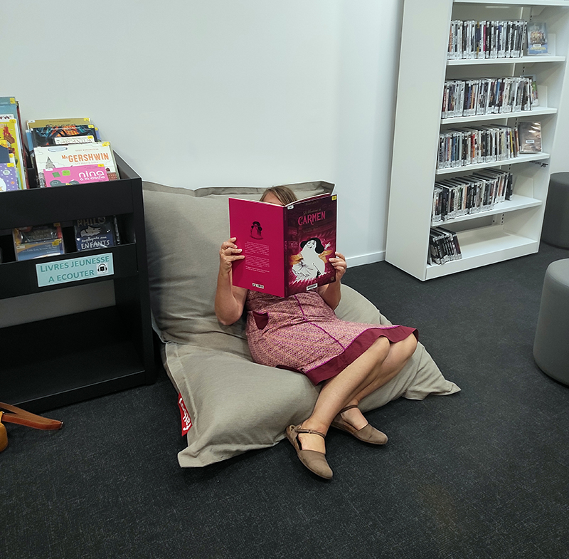 Au 2e étage, il y a les bureaux du personnel où sont réalisées diverses tâches, comme par exemple la préparation des commandes, la réception des ouvrages (pour les 12 bibliothèques du réseau), le catalogage, l’équipement des documents (mettre les côtes et couvrir les livres).