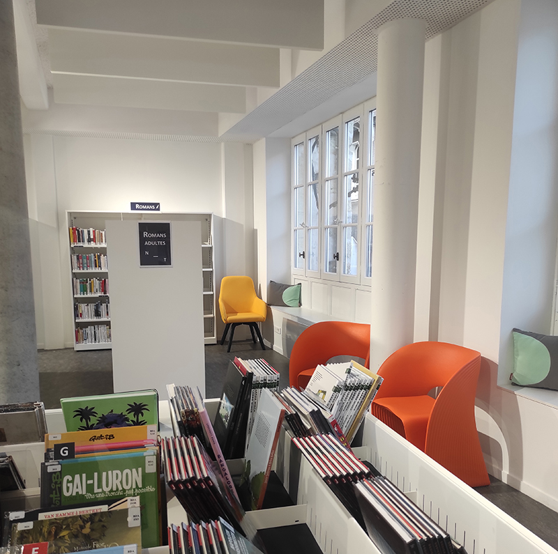 Au sous-sol, un espace atelier pour créer avec de grandes tables et une balançoire au milieu d’un puit de lumière traversant les trois étages. Au rez-de-chaussée, l’accueil, des espaces dédiés à l’informatique (l’Etabli), un espace pour les jeux vidéos nommé Le labo (chaque espace porte un nom en rapport avec la quincaillerie), un espace détente et un espace animation pour accueillir des groupes. Au 1er étage, une partie ludique pour les plus jeunes et l’espace acoustique qui donne envie de flâner. De l’autre côté, on trouve l’univers jeunesse, les BD, les premiers romans, les mangas et la partie adulte.